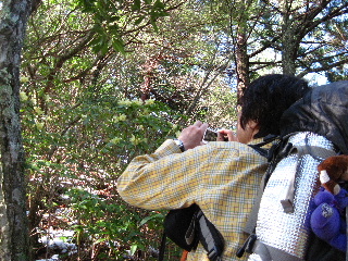 | 朝通った西ルート・東ルートの分岐点に着きました。これから登られるご夫婦?に「こっちはお花が無いですよ、そっち(西ルート)の方がいいですよ」とトシちゃんが声をかけています。ご夫婦もニッコリと笑って西ルートへ。 | |