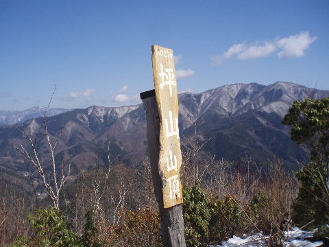左は奈良倉山。奥中央は飛竜山。雲取山は山頂看板に隠れてしまいました。 |