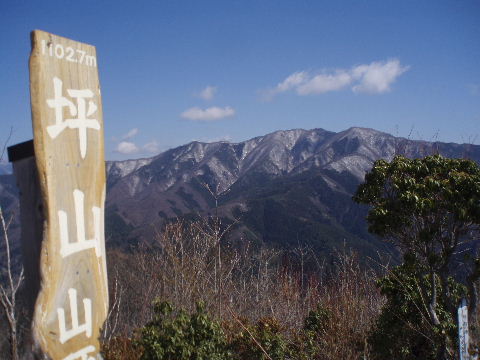 | 坪山山頂。1102.7mの低山ですが360度のすばらしい展望です。今回で4回目。Sさんに教えていただいて初めて登ったのは12月の暮れでしたが、その時は静かな山頂でした。展望を楽しむならば冬の晴れた日がお薦めです。バックは奥多摩。 9時頃で既に数名。狭い山頂ですが、少し早めに登ったおかげでゆっくりできました。絶え間なく登ってきますが、このあともっと混み合うことでしょう。 |