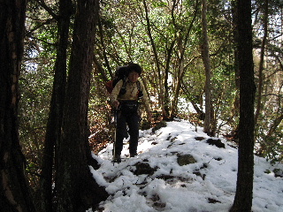 | 歩き始めたばかりですが麓にもまだ雪が残っています。上はどうかと気になりますが、一応軽アイゼンは持ってきていました。上はそれなりに雪が残っていて特に下りは気を遣いましたが結局使いませんでした。 | |