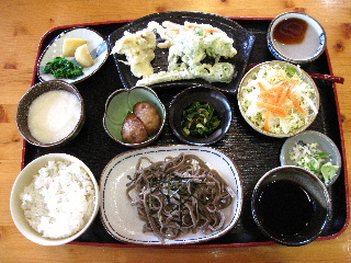 | びりゅう館で手打ち蕎麦をいただきます。ちょっと豪華にレディースセット。お蕎麦と麦ご飯の量が少なめ。1200円。天ざるのほうがお蕎麦が多めです。 | |