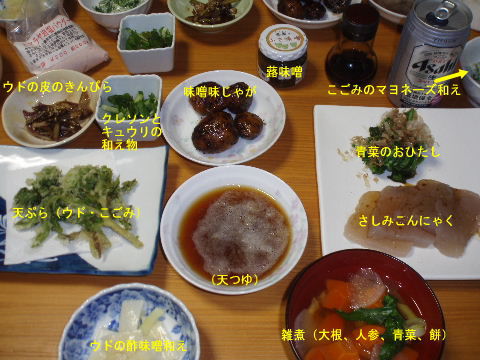 | びりゅう館で買ってきたもの。 味噌味のじゃが芋(惣菜、手作り)、蕗味噌(瓶詰め、手作り)、さしみこんにゃく(手作り)、ウド、こごみ、クレソン、青菜(名前は忘れました^_^;)。全部で1220円。安いです♪ 天気の寒暖激しく、物価高騰の折助かります。 |