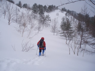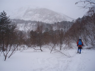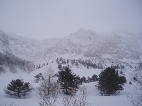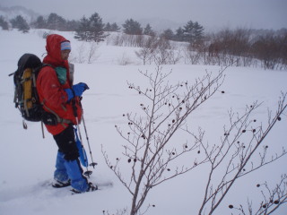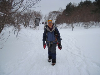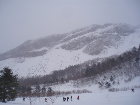 | 小雪が舞い、山頂部は曇っていますが 前方に天狗岩がかすかに見えました。 ![]() |