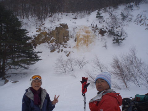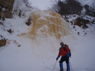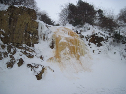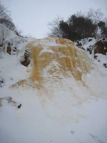 | 【裏磐梯の厳冬に現れる幻の金色に輝く氷瀑。 噴火口の硫黄分や鉄分を含んだ氷が幾重にも重なって凍り、 黄色みを帯びていることから 「イエローフォール」と呼ばれるようになりました。】 (裏磐梯スキー場HPより) ![]() |
