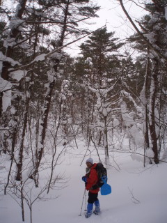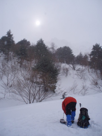 さすがにつぼ足では沈み、やはりスノーシューを履くことにします。 |