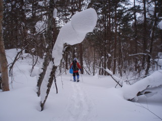 雪をまとった木々の間をいきます。 |