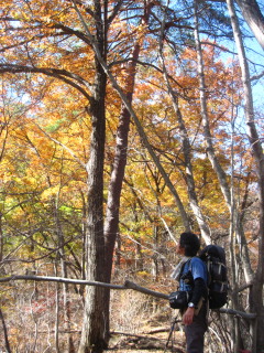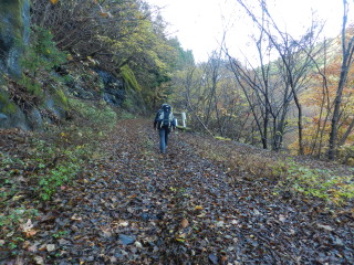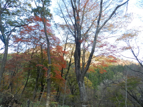 部分的に残っている紅葉ですが、落葉している木も多く、今年はどうなんだろう?と思いながら進みます。 もしかしたら前日の雨と風で上の方も落葉してしまったかしらと心配になります。 |