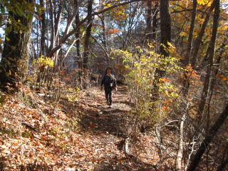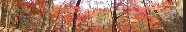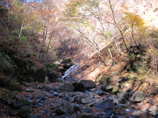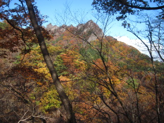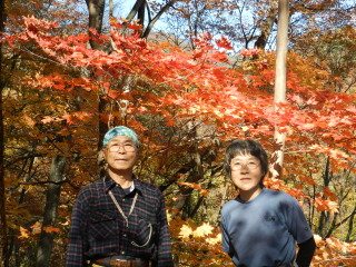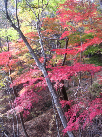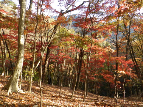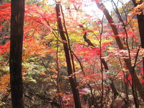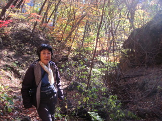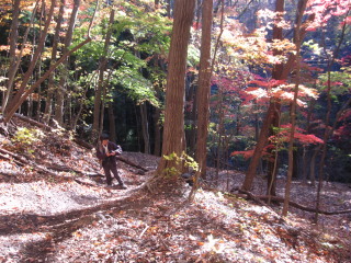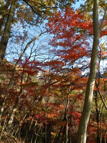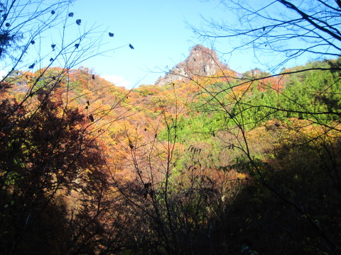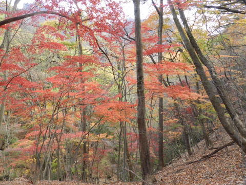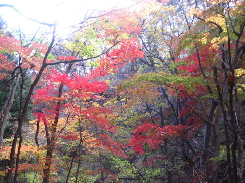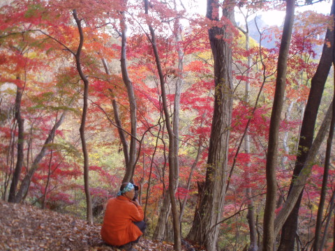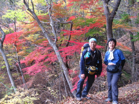 | H23年11月20日(日) 天気;晴 Member.2人(トシちゃん、sanae) 【コ ー ス】(〜は歩、休憩時間含む。) 国民宿舎裏妙義P8:20〜女坂入口9:06〜谷急沢9:38〜高巻き途中で引き返す〜谷急沢10:54〜女坂入口11:25〜三方境入口11:56〜680mくらいまで(途中で大休憩、紅葉見物)〜三方境入口15:55〜国民宿舎裏妙義P16:05・・・(所要時間約7時間45分) |