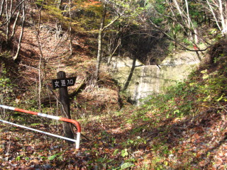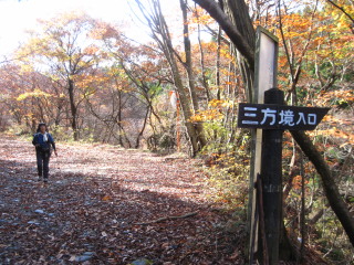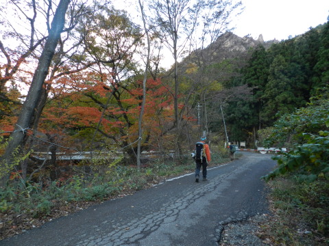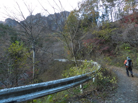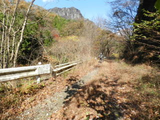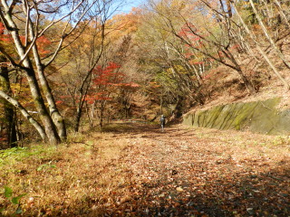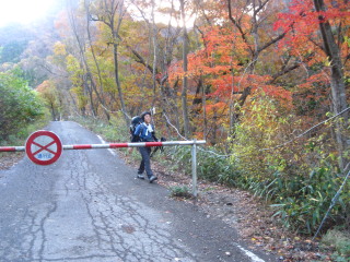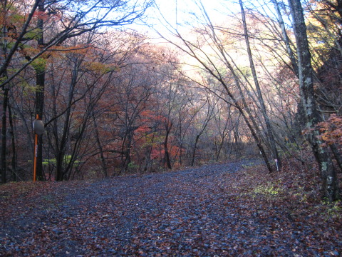 林道へ出て登山口へと向かいます。 そのまま行けば一時間くらいで着いてしまいますから太陽光がまだ足りないかも。 時間的に紅葉の写真を撮るにはもう少し遅い時間、陽が高い方が良いね・・・ということで、先に女道の方から行って回ってみることにしました。 |