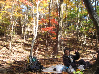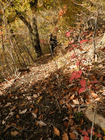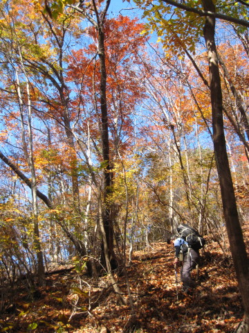 休んでいる間に下ってくる人数名。 登る人も数名でしたが時間的に山頂を目指すのではなく紅葉を愛でる人たちで空身でした。 |