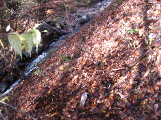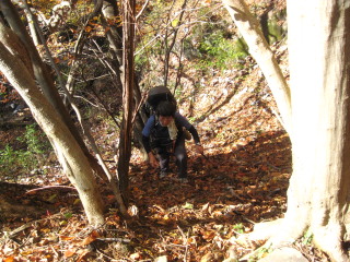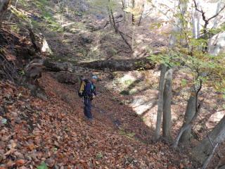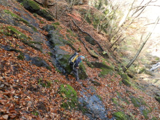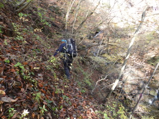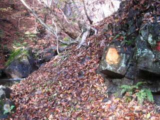 足元に気をつけて進みますが、濡れ落ち葉に足をとられてトシちゃんが滑ってしまいました。下まで落ちないで良かったです^_^; もうちょっと上を歩けば良かったのか?選んだつもりでしたが滑った後をよく見ると濡れた落ち葉の下が一枚岩でした。 先を見ても同じような斜面が続いています。ここを無事通り過ぎても果たして先がどうなっているのか分かりませんからここで即引き返すことにしました。 |