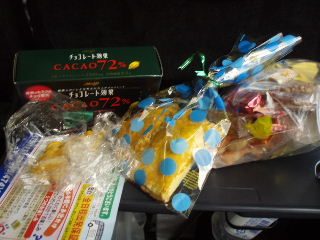 | バスに乗り込むと仲間内でお菓子がどっと集まります(^^ゞ 手作りのパイやホットコーヒーも持ってきてくれる人がいて\(^o^)/ | |