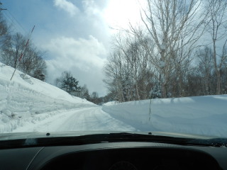 信州中野インターもタイヤチェック。混むので手前の小布施で下りることにしますが、ここもまた出るまで渋滞(-_-;)。予定より時間がかかってしまいました。 一般道に出て徐々に白い道に変わっていきます。期待していなかった空は青空に♪ |