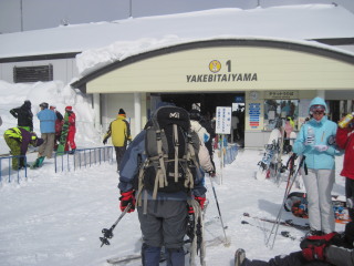 準備を済ませて第一ゴンドラ乗り場へ。 スマートなスキーヤー、ボーダーばかりで我ら浮いてます^^; ゴンドラチケットは往復で一人1450円(上り片道950円。下り片道500円)。営業時間土曜休日8:00〜16:30(平日8:30〜16:30)。P.M 売り場の人に聞くと、ハイクの人は今日だけでなく、ずっと見かけないとのこと。意外でした(^^ゞ |