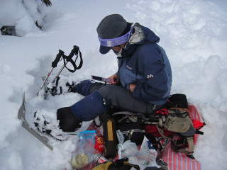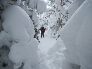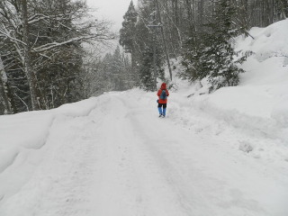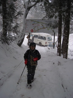 | 週末は蔵王のモンスターを見に行こうか迷いましたが、天気予報はイマイチ。行くならやはり晴天の時が良い。昨年も行っていることですし、それならば以前から行きたかった志賀の野猿公苑にしよう♪ 野猿公苑は雪予報の日曜にし、土曜はちょっとだけスノーシューを楽しもうと、当日朝5時過ぎに出発しました。 |