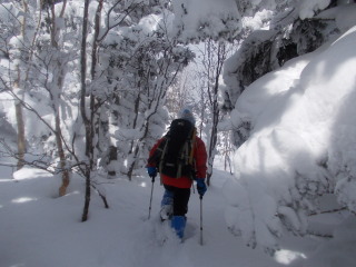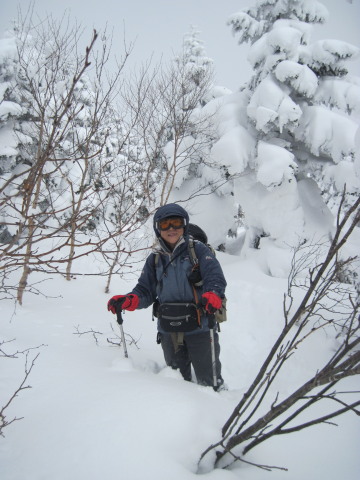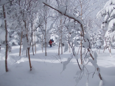 | あったかいココアを飲んで、のんびりしたあと、またサクサクとまっさらなパウダーをかき分けていきます。 ウハッ!最高! |
