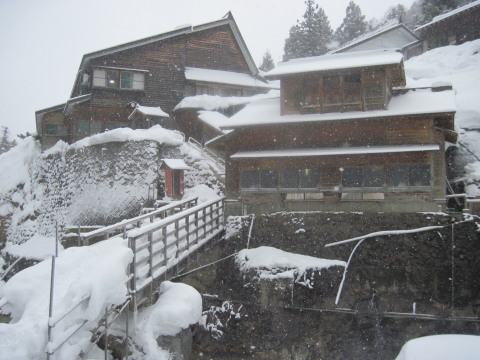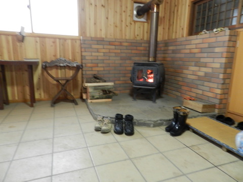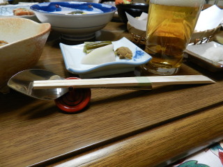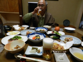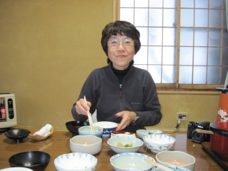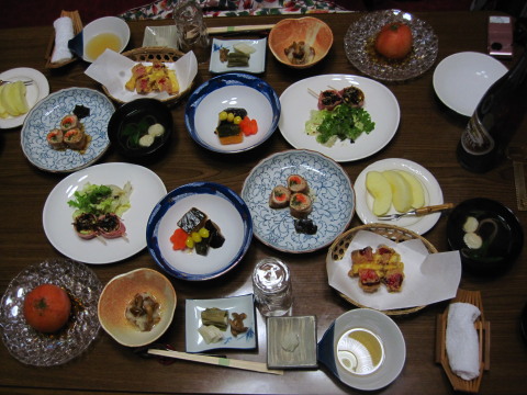 しかも部屋食。でもこちらは泊る部屋の隣の部屋で、こちらに用意されています。つまり私達だけで二部屋使っていることになります。どちらもストーブと炬燵で温か。居心地のいいお宿でした。 食事が終わると既にお布団も敷かれ、これがまたフカフカで気持ちよく、ぐっすり眠れました。もっとも寝不足で疲れていたせいもありますが^^; お湯のみセットも新たに交換されていて、仕事が実に丁寧で手早いこと!びっくりでした。 |