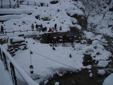 | トシちゃんが温泉に手を入れてます。 丁度いい湯加減だったそうな! 温度は大体40℃くらいだそうです。 周囲では公苑の方がさりげなく雪かきしたり、 お掃除されてます。 そういえば糞もなくきれいでした。。。 ![]() |