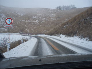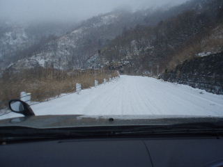 | スキー場を過ぎると白い道路になってきました。今年はニッコウキスゲを見に来た山並みですが、この時期まだ真っ白にはなっていません。 | ||||