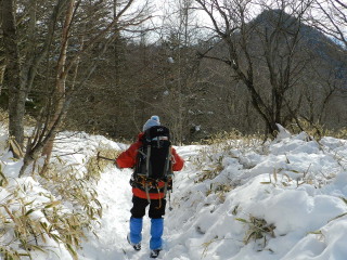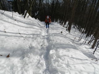 トレースはしっかりついています。 それでも歩いていると熱くなり、途中で一枚脱ぎますが、怠けた体は思うように足が進みません^^; のんびり、のんびり登っていきます。 |