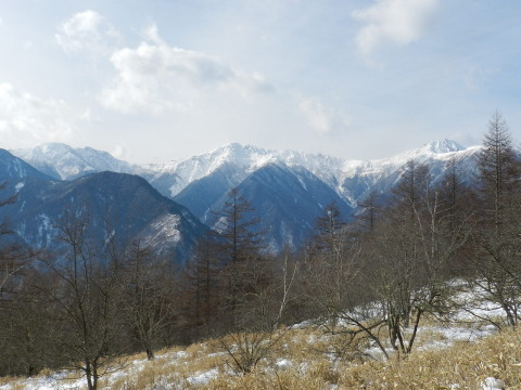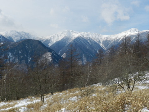 稜線、高谷山との分岐に出ると正面に南アルプスの山が見えて嬉しくなりました。峠まであと2〜3分。 | |||