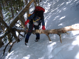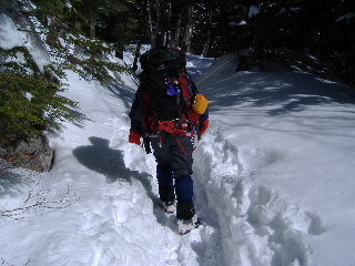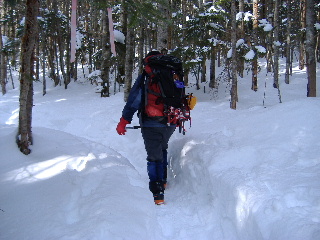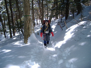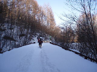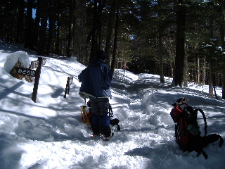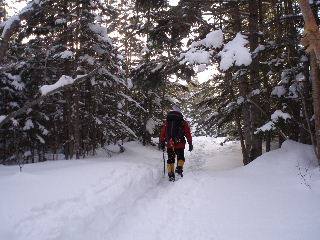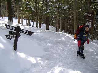 | 三連休の最終日で、私たちは申し訳ないくらい楽なスノーハイクでした^_^; 登っていると、数パーティとすれ違いました。まだ早い時間なのにもう下山?と訝しく思いましたが、その理由は後から分かるのでした。 |