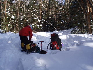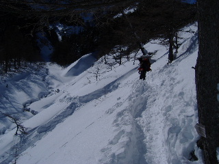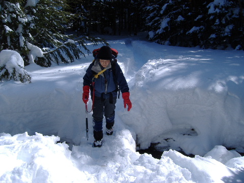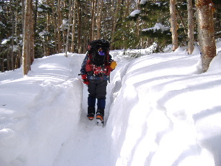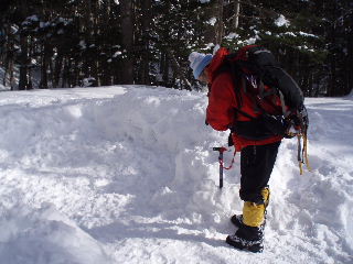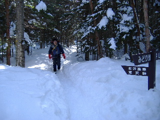| 中山へ向かったのと同じくらいのラッセル跡でした。やはり昨日は大変だったのではと思います。硫黄岳や天狗岳へ向かう人は本沢温泉の方に泊まる人が多いと思われますから、しらびそから本沢の間は尚更大変だったと思います。 | ||