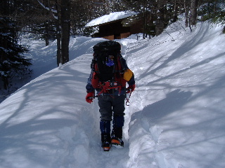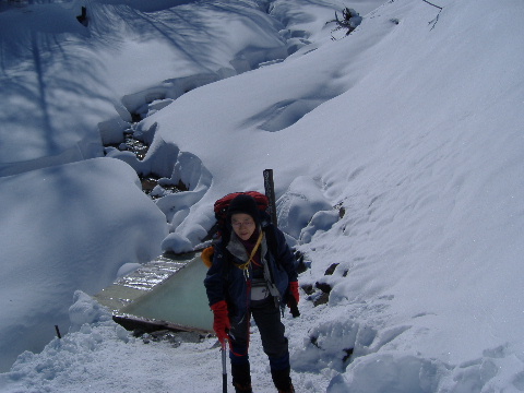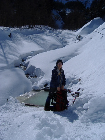 | H20年2月9-11日(土−月) 天気;初日雪、二日目晴れ、三日目晴れ Member.2人 【コ ー ス】(〜は歩、休憩含む) 9日:稲子湯登山口10:30〜途中お昼休憩12:20-50〜しらびそ小屋13:30(テント泊) 【休憩含む所要時間約3時間】 10日:しらびそ小屋9:15〜中山峠12:25〜(途中甘酒休憩^_^;)〜中山山頂14:15〜中山展望台14:20-30〜中山峠(アイゼン装着)15:15-25〜しらびそ小屋16:25(テント泊) 【休憩含む所要時間約7時間10分】 11日:しらびそ小屋7:45〜本沢温泉(テント場で休憩)9:20-40〜野天風呂分岐9:52〜野天風呂9:55-11:00〜お昼休憩12:05-38〜しらびそ小屋13:25(コーヒータイム&テント撤収)14:45出発〜稲子湯登山口15:55【休憩含む所要時間約8時間10分】 |