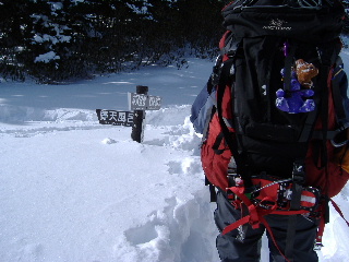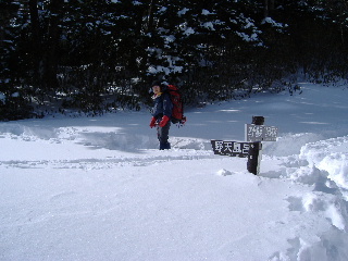 | 硫黄岳分岐のところまで戻ってくると、なんと男性がお一人で登ってきました。 「野天風呂は今貸し切りですよ」と教えてあげますが、目的は硫黄岳でした。既に11時ですが日帰りピストンだそうです。登ってくる途中すれ違った人たちから、夏沢峠の手前から要ラッセル、硫黄岳山頂へも最初はラッセルと聞いてきたようですが、行けるところまで行ってみるということでした。 峠まで登ってしまえばトレースはあると思うのですが、私たちも行っているわけではないので迂闊なことは言えません。 |