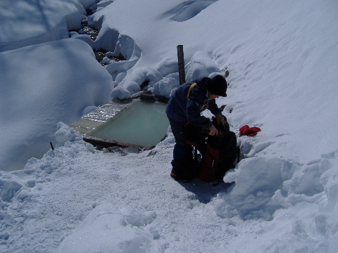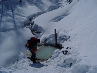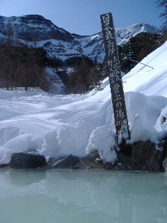 | ここもテント跡が残っていましたので、そこで10分ほど一休み。 時間は9時半。順調に行けば硫黄岳に12時前には着きそうです。・・・と、この時は思いました。 再び歩き出して、以前入った“石楠花の湯”!・・・チラリと目をやりつつ、入浴タイムをチェックします。混む時間帯は男女別になっていますが、15時までフリータイム。誰も入っていません。トシちゃん温度もチェック。申し分のない温度らしい! 二人の目が(温泉にしようか〜♪)と言っています(笑) |