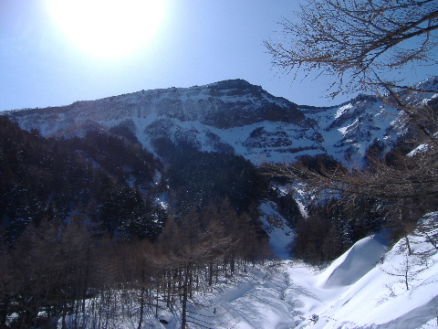 途中振り返ると硫黄岳と太陽! 山頂に向かっていればまだ登りの途中のはず。 穏かな快晴ですからピークは気持ち良かったことでしょう。 でも全然悔しくなんてありません(笑) |