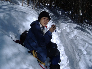 ほぼ登りきったところでお昼休憩。 登山道沿いに即席簡易ベンチをつくります(^^ゞ 雪山はこういうところが便利ですね(^_-)-☆ カップ置き場も簡単に雪に差し込んで倒れず!こぼれず! |