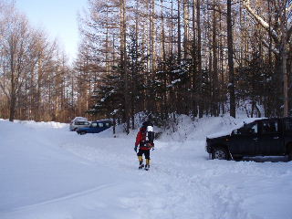 | 昨日は進行方向右の中山峠の方に向かいましたが、今日は左。硫黄岳方面です。 8時、気温はマイナス6度。 |