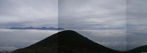 | 阿弥陀南稜の彼方には北アルプスが、今日も長く日本海側の方まで続いている。人工物は雲海の下に隠されてなんともスッキリと。 その左側にはもちろん、乗鞍岳、御嶽山、中央アルプス。 ↓ |