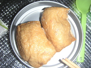 | それらを眺めながら早めの昼食。 tomomiさんのアイディアを拝借して、昨夜のうちに作っておいたお稲荷さん(ご飯もお米から炊いて、中身は寿司太郎の具が入っています)。なかなかGood!でした(^-^)v 他には同じく昨夜のうちに作っておいたナスの漬物(これはナスよりキュウリやキャベツの方が良かった)。テルモスに入れたお湯で即席味噌汁。いわしの缶詰とリンゴ!最後にコーヒーで締めくくり、いつもよりゴージャス! |