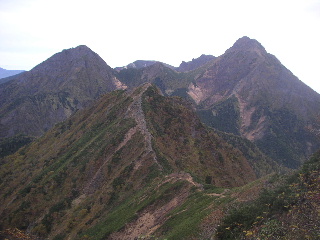 ↑ 権現岳(左)から編笠山に続く稜線 |