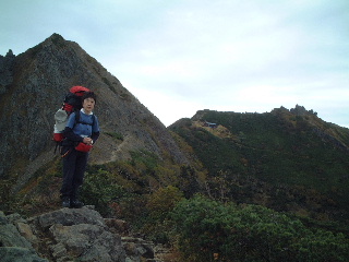 | 梯子を登り終えて安堵の笑み。(バックは赤岳) このピークが旭岳だろうか?未確認(間違っていたらゴメンナサイ)。そのまま巻いて権現岳へ。 |