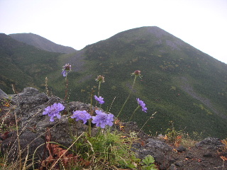 | 咲き残りのマツムシソウ。雨の中生き生きしている。編笠山、権現岳をバックに写して立場川キャンプ場方面に下る。 | |