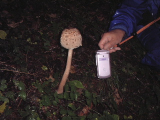 | 千枚岩から登山道を少し行くと、第五配水地と広河原の分岐。しっかりした道標だったので広川原へと向かったが、途端に荒れた登山道になった。 心細げに道迷いしないよう先頭を行くトシちゃん。こちらは目を皿のようにしてキノコを探しながらついていく。ハナイグチもう二つゲット(帰宅して翌日無事にお腹におさまる)。 こんなキノコも発見。これは撮るだけ。それがなんと!これはカラカサタケと言って、食べられるそうだ。もったいないことをしたなぁ〜、こんなに大きかったのに!(笑)。教えていただいたheppoco隊長さん、テントミータカさん、ありがとうございました。 |