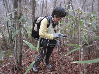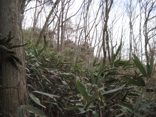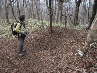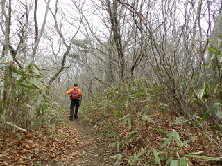 尾根へ出ても登山道は無く、藪で登山道が見えません。 |