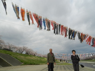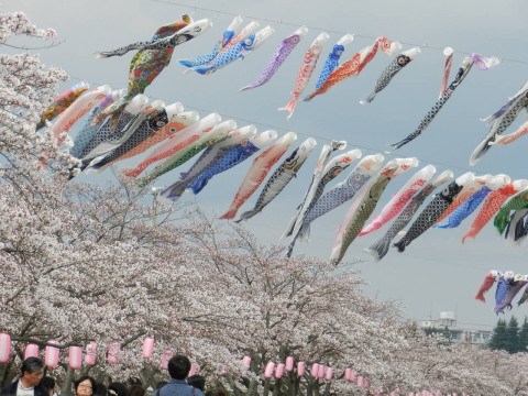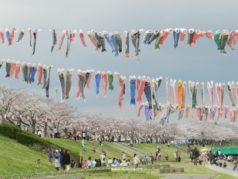 須賀川市釈迦堂川沿いの桜と鯉のぼり。