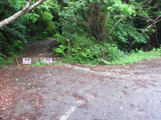 駐車場の近くでアサギマダラが飛んでいて驚きました。写真を撮れず残念。 駐車場の先に登山口。車両通行止めのロープがかけられています。 |