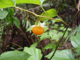 途中に木イチゴ。美味しそう♪ モミジイチゴに似ていますが、葉が違いましたので、つい口にしそうになりましたが止めておきます^_^; |