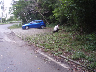 | 与那覇岳登山口。林道はまだ先にも続いていましたが、先着の車もあり、しっかりした登山道がありそうなので此処に車を置きます。5〜6台楽に置けそうです。 後から来た人に山頂までの時間を聞くと登り1時間くらいとのこと。そのくらいなら行ってみましょうかとここでも軽いノリ・・・ この方はタバコが嫌いと、吸いながら話しかけたトシちゃんに言われたそうで、トシちゃん苦笑。(そうよ、第一失礼よ・・スミマセン-_-;) この方は与那覇岳ではなかったようです。 |