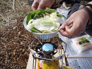 | 「できた〜」 ・・・のは、ガスでやった方。 「やっぱりガスだね!」断然早い! トシちゃん食べてます。 固形燃料を使うのは改善の余地あり。ひとまずsanaeのうどんをガスの方に移し、チロチロ燃えている固形燃料の方にはお湯を。 |