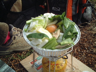 | 鍋焼きてんぷらうどんです。手軽にスーパーで買ったアルミ箔入りですが、持ってきたお野菜たっぷり&卵入り♪ 何か気がつきませんか〜 “ごとく”初使用で〜す♪ (安定がよくなりました♪) |