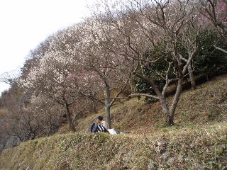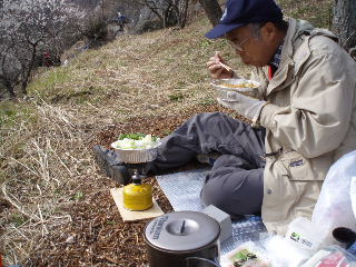 | 今日は時間も遅いですし、病み上がりですから山歩きは止めて観梅です。シートを広げてお昼ごはんにします。 | |
