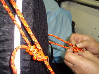 | 湯河原駅に着くと急いでホームに駆け上がりました。電車が遅れていたお陰で各駅5時21分発の上りにセーフ。 今回はそれほど歩きませんでしたので、話しながらまたまたロープワークの練習(笑)・・ザックに結びつけながら単なる暇つぶしです。 |
