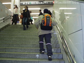 | 最寄り駅に着きました。見てください、右側に昇りエスカレーターがあり、皆さんそちらから行くのにトシちゃん元気良く階段を昇っていきます^_^; なぜかザックの時は歩きます!(笑) | |