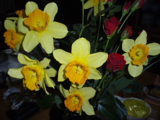 | 駅ビルのストアーで夕飯の買い物をしている間にトシちゃんが買ってきてくれました。 sanaeの好きな真っ赤な薔薇と水仙(本当は日本水仙ですが無かったそうで。でも薔薇とはこちらの方が合いますね)\(^o^)/ |